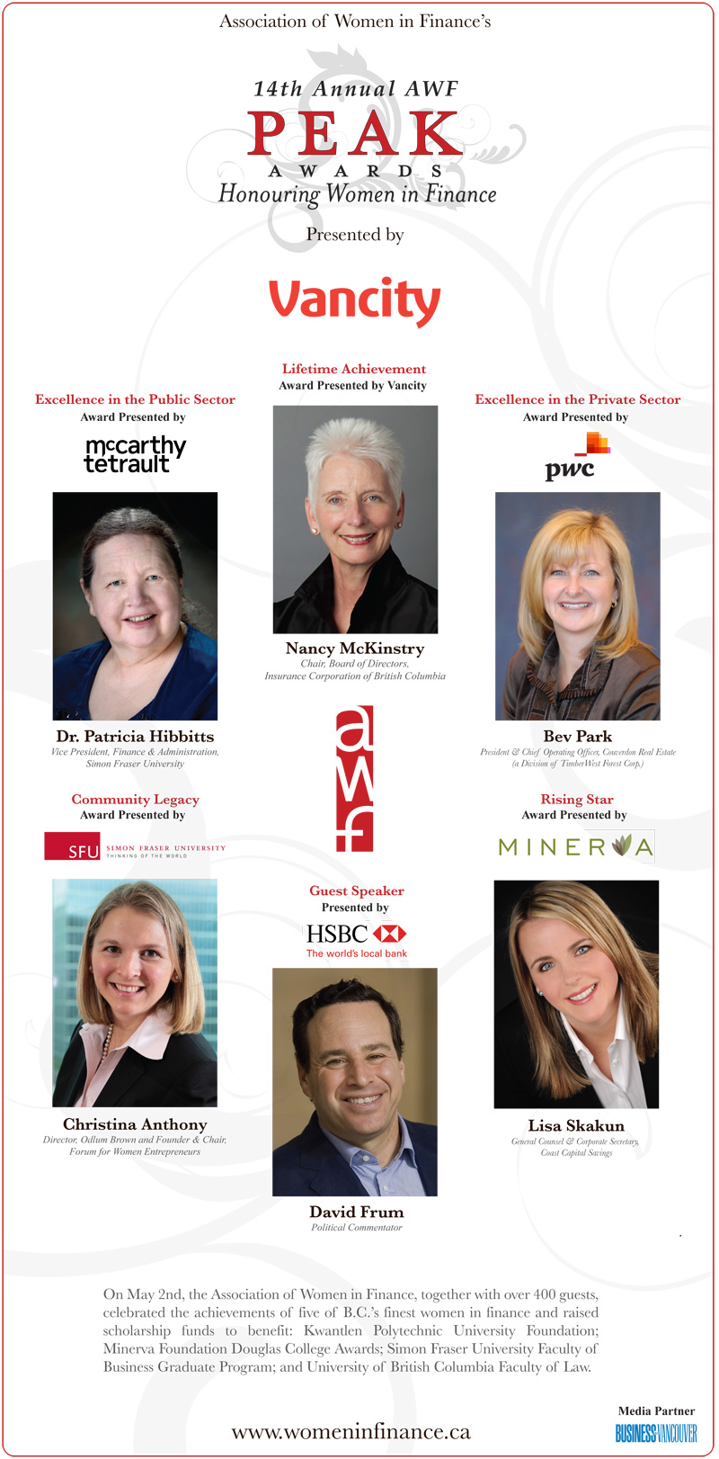 This year, the AWF paid tribute to the Minerva Foundation, in recognition 2011 PEAK Lifetime Achievement Honouree, Nancy McKinstry, C.M.
